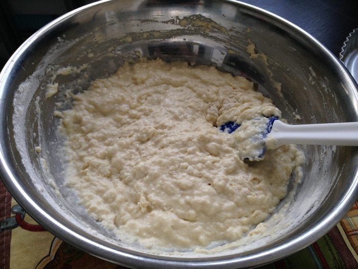 И, постепенно подмешивая муку, с помощью лопатки или миксера вымесить тесто до однородной консистенции. Консистенция - густой сметаны!