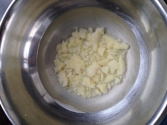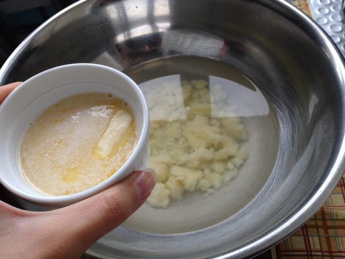 В другой миске соединить картофельное пюре и теплую воду.