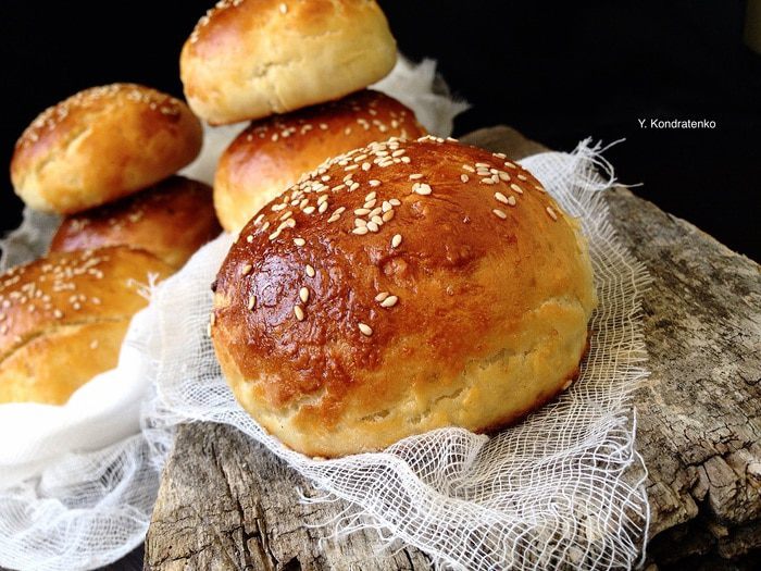 На мой взгляд, это идеальные булочки для гамбургеров! Воздушные, ароматные, не хлопотные в приготовлении и очень вкусные! Если увеличить количество сахара(примерно 75г) и добавить изюм в тесто, получиться отличная сдоба к чаю!