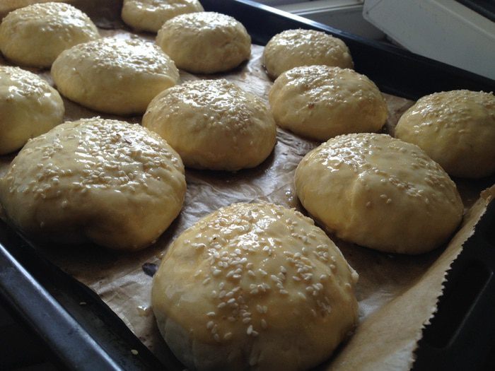 Смазать булочки яйцом, присыпать кунжутом и отправить в духовку на 15-20 минут при температуре 200 градусов.