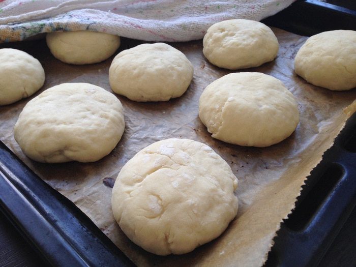 Отщипываем кусочек теста и формируем булочки. Выложить заготовки на противень, застеленный бумагой для выпечки, на приличном расстоянии друг от друга! Булочки увеличатся раза в два! Немного приплюснуть наши заготовки пальцами, накрыть полотенцем и оставить ещё на 30-45 минут в теплом месте.