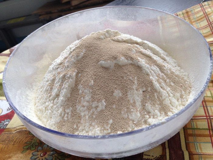 В миске соединить муку (300 г), соль и сухие дрожжи. Можете взять живые, их количество пересчитывайте согласно упаковке.
