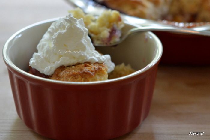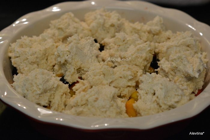 Выложить небольшими лепешками поверх фруктовой смеси. Посыпать сверху сахаром. Выпекать 25-30 минут. Или до золотистого цвета.