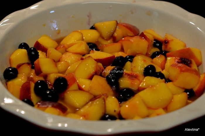 Разогреть духовку до 210 гр. Персики помыть и нарезать кубиками. Добавить ягоды мытые, крахмал, ванильный экстракт, сироп агавы или можно заменить на мед.