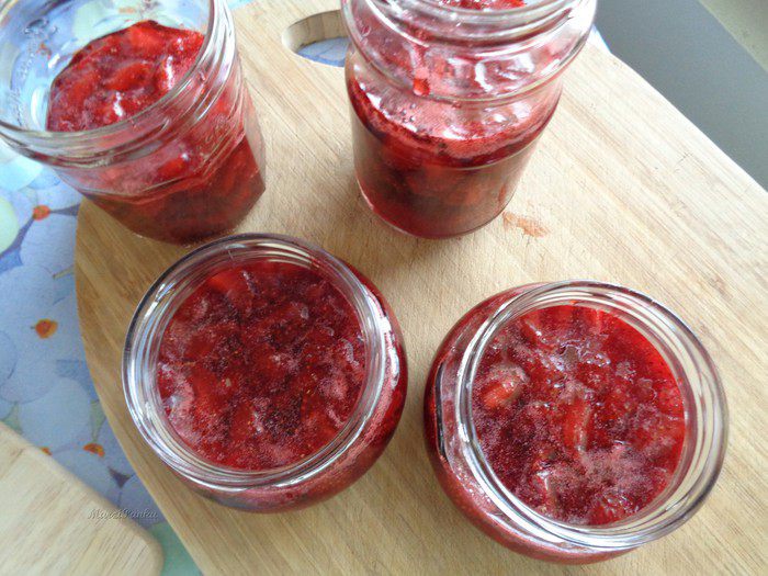 Разлейте конфитюр по банкам, с закручивающимися крышками, заполняя каждую на 2/3.