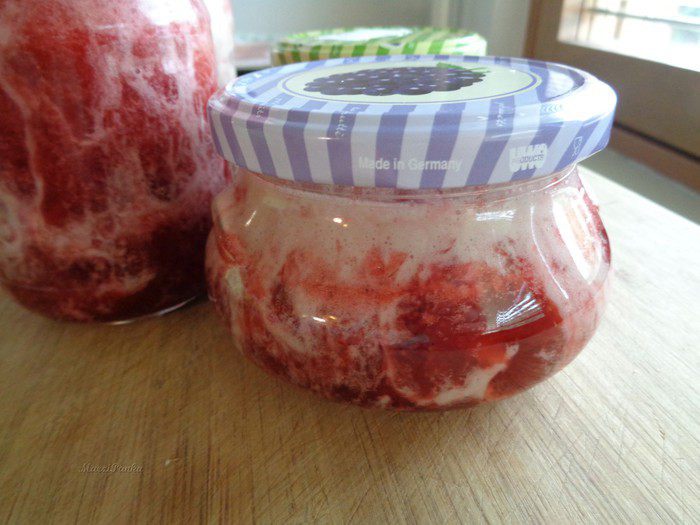 Срок хранения у такого конфитюра недолгий - не более 4-х недель в холодильнике. Кстати, если будете пробовать конфитюр до того, как поставите в холодильник, будете наслаждаться густым клубнично-маршелловым кремом. В холодильнике маршмеллоу застывает и тогда можно зачерпывать ложечкой два слоя!