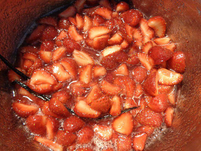 Клубничную смесь доведите до кипения, постоянно помешивая. 3 минуты дайте покипеть. Извлеките ванильный стручок.