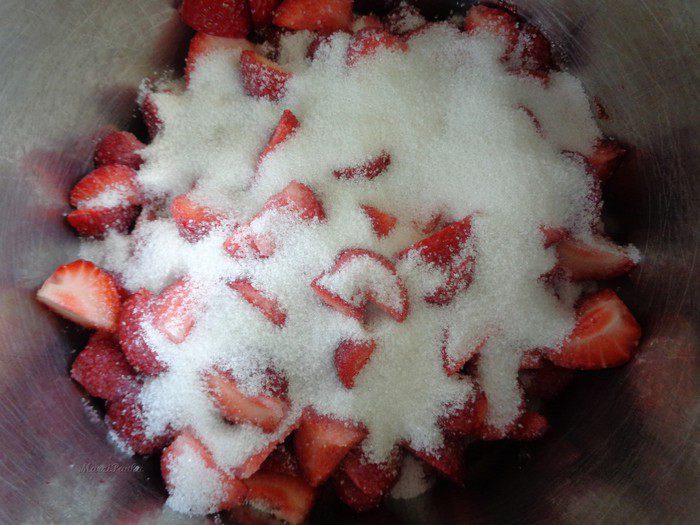 Смешайте клубнику в кастрюле с соком лимона и желирующим сахаром.