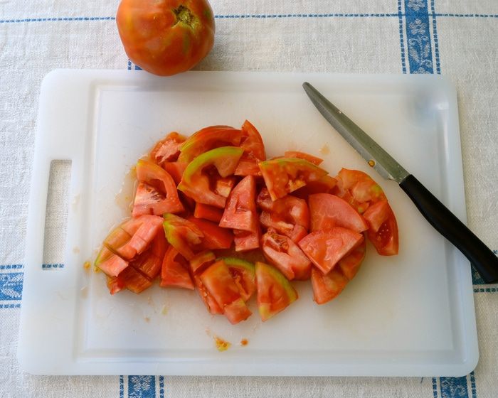 Помидоры вымыть и нарезать произвольно. Выложить в миску-салатник.