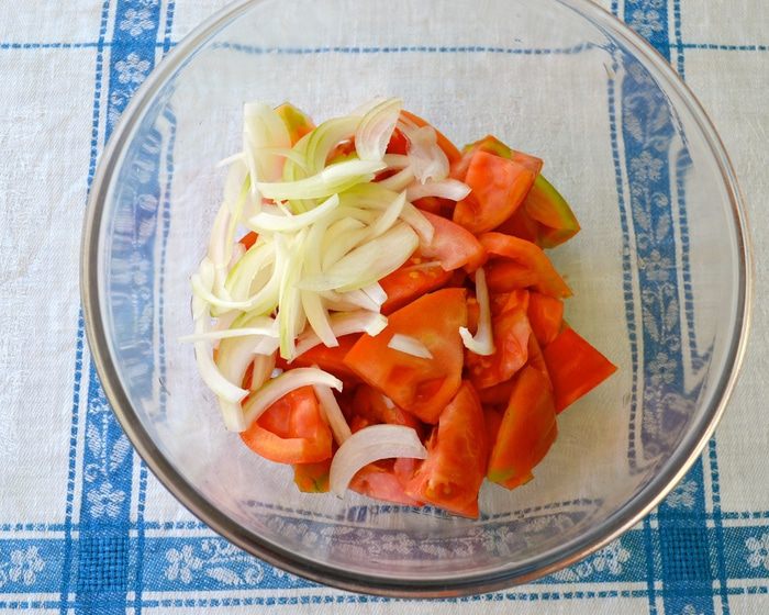 Лук (лучше всего красный! он и по цвету смотрится красиво в этом салате, и вкус у него мягче...) нарезать перьями и добавить к помидорам.