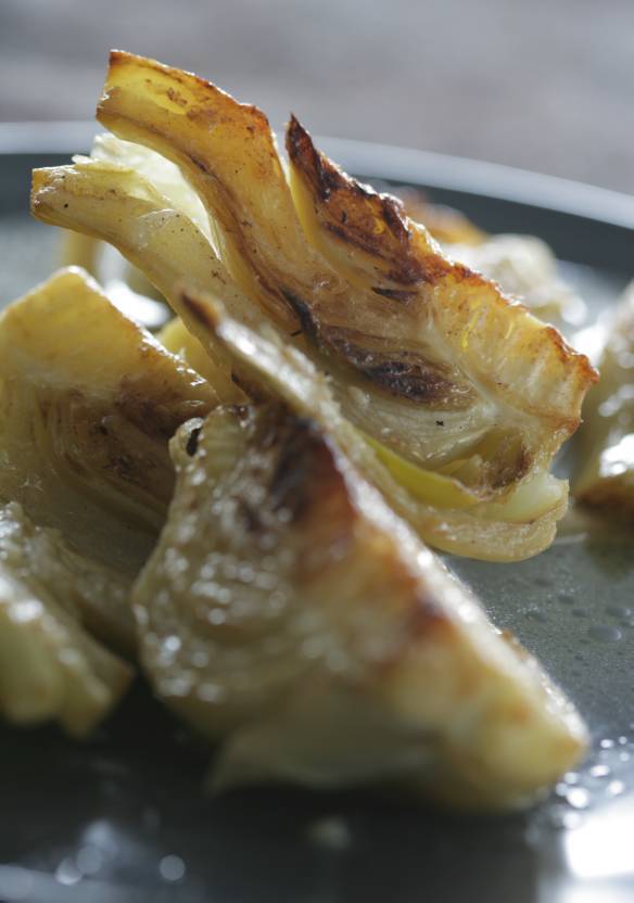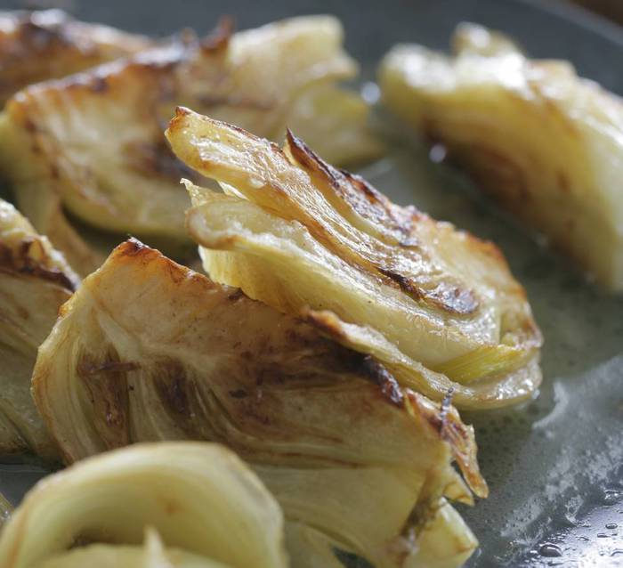 В тяжелой сковороде растопить масло и обжарить фенхель на медленном огне со всех сторон.