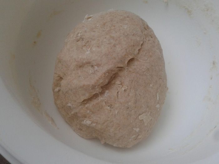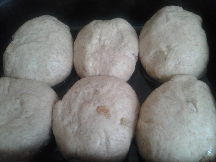 В подошедшее тесто добавить промытый и обсушенный (обвалять в муке) изюмчик и разделить тесто на 6 булочек. Сложить их в смазанную маслом форму, в которой будем выпекать и оставить на 20 минут (пока разогреть духовку до 200 градусов). Расстоявшиеся саечки смазать молочком и посыпать цельнозерновой мукой.