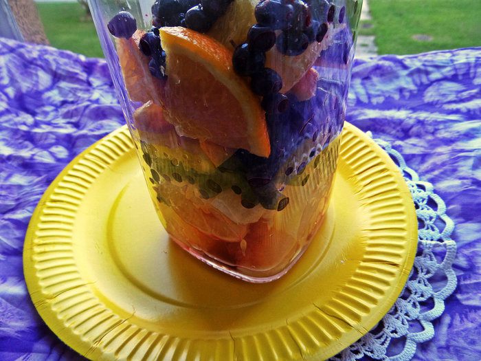 Насыпаем в кувшин грейпфрутовые кусочки, затем промытую чернику (тоже можно слегка подавить).