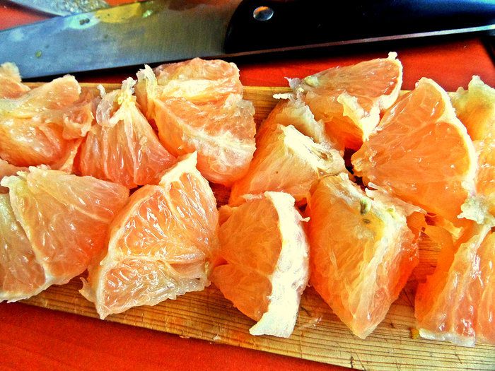 Грейпфрут очистить от корок и нарезать крупно. Желательно подавить немного прямо в кувшине.
