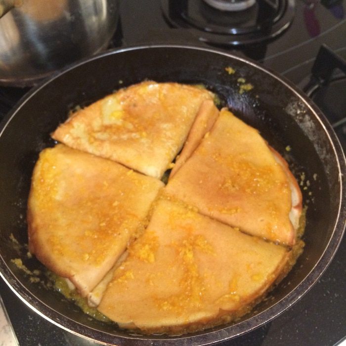 В получившийся сироп перекладываем блинчики, обжаривает 2-3 минуты! Подаем на стол украсив долькой апельсина и стручком ванили! Приятного аппетита!