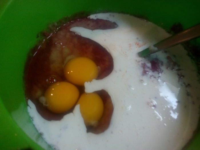 Добавить хлебную пасту, сливки, яйца, коньяк, соль и перец.