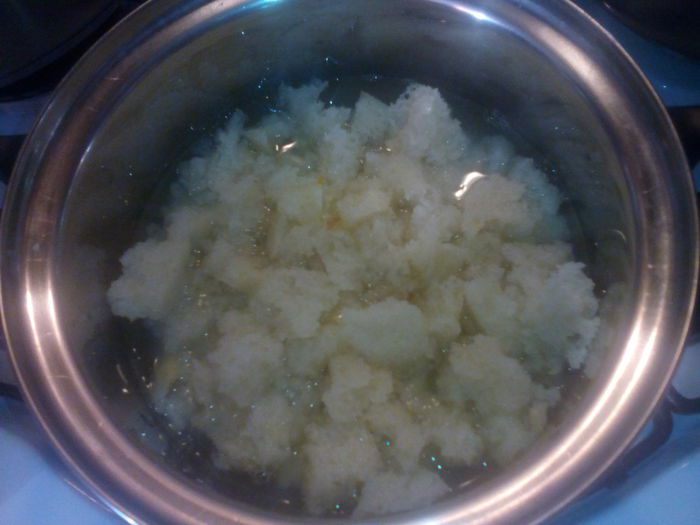 Мякиш накрошить, размешать с бульоном и поставить на маленький огонь.