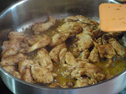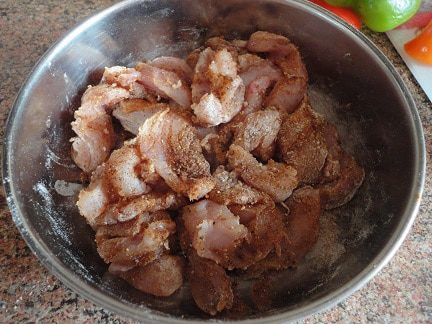 Поставить варить рис в 2 литрах подсоленной воды. Мясо индейки или курицы нарезать полосками, посыпать черным перцем и мукой.