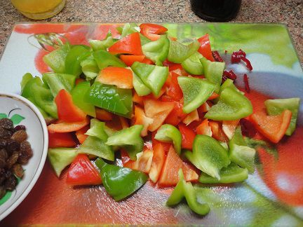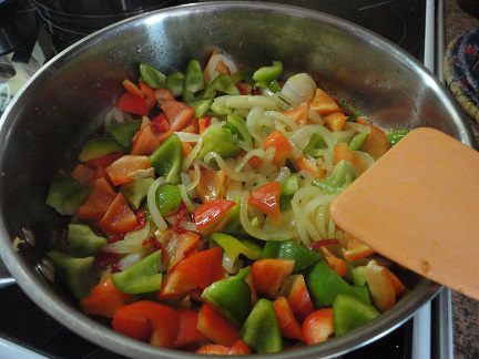 Затем мясо снять со сковороды, а в оставшемся жире спассеровать лук до золотистого цвета. Добавить нарезанный перец и тушить его 2 минуты.