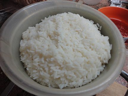 К этому времени готовый рис откинуть на дуршлаг, дать стечь воде и выложить его в сковороду.