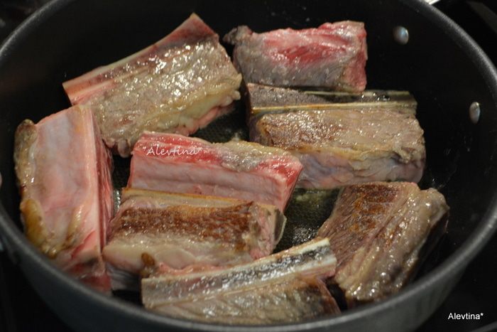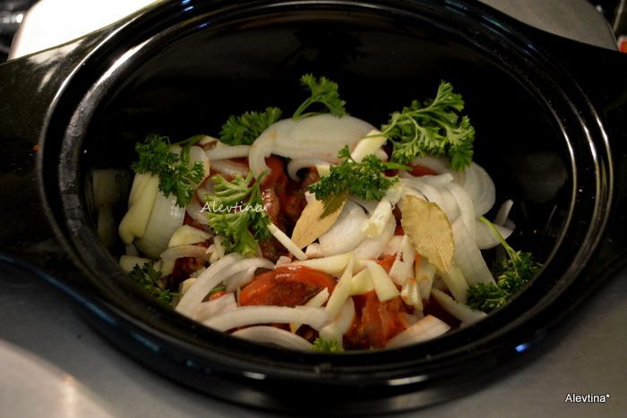 Переложить ребра в медленноварку, залить красным вином, бальзамическим соусом, томатным соусом. Положить нашинкованный тонко лук, чеснок, лавровый лист, сверху зелень петрушки. Поставить в режим медленный на 7 часов. В мультиварке используем режим тушения, время как указано в инструкциях, нужно чтобы ребра после тушения легко отделялись от кости.