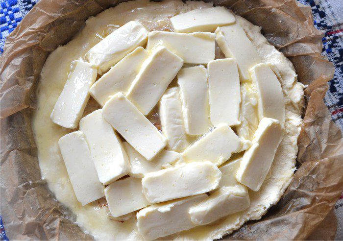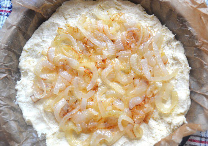 Поделить тесто на две части. Форму выстелить пекарской бумагой и смазать маслом. выложить дно пирога. Разложить жаренный лук равномерно отступая от края.