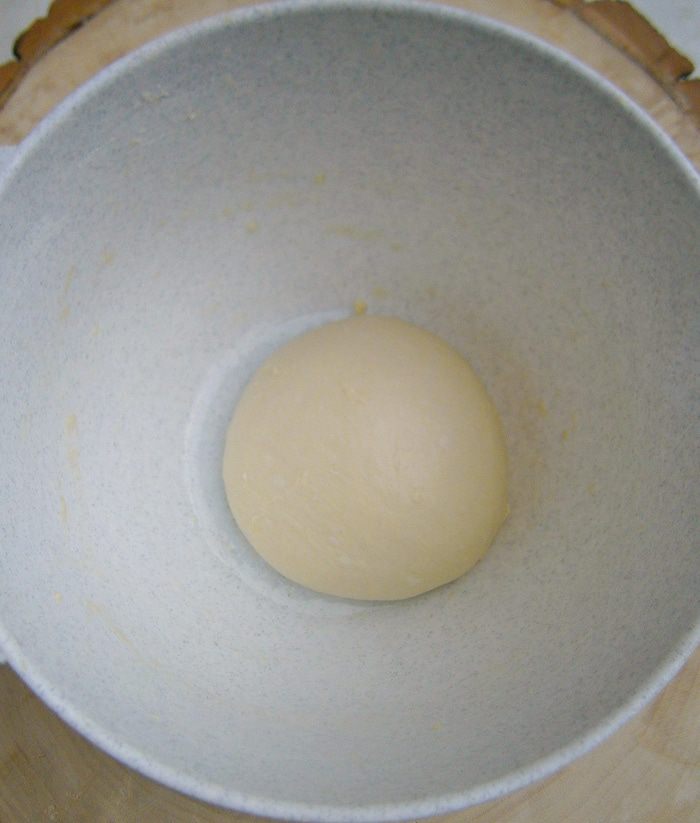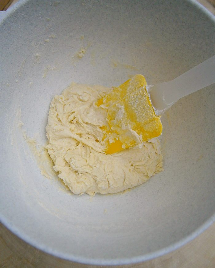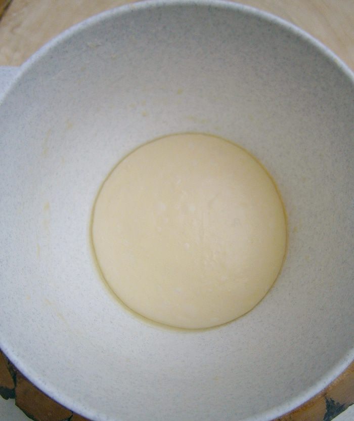Смешать дрожжи с оставшейся жидкостью, перемешать и частями, просеивая муку, замесить мягкое тесто. Сначала тесто будет липким, но муки не добавлять! Тесто нужно не просто вымешивать, а сильно ударять об стол, подкатывать в шарик, снова ударять и снова подкатывать и так, пока тесто не будет отставать от рук и стола. В конце замеса ввести соль и мягкое масло.