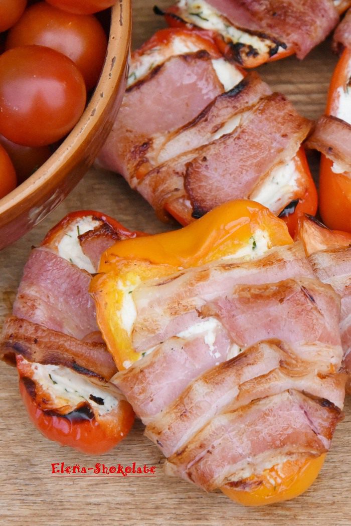 Перец снаружи стал более мягким, кое-где с подпалинами, а внутри остался сочным, с нежной начинкой из ароматного сыра, покрыт поджаренным беконом.