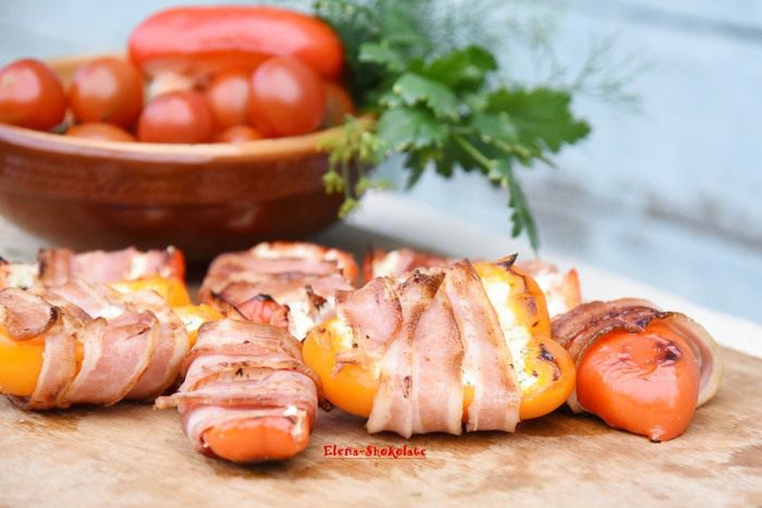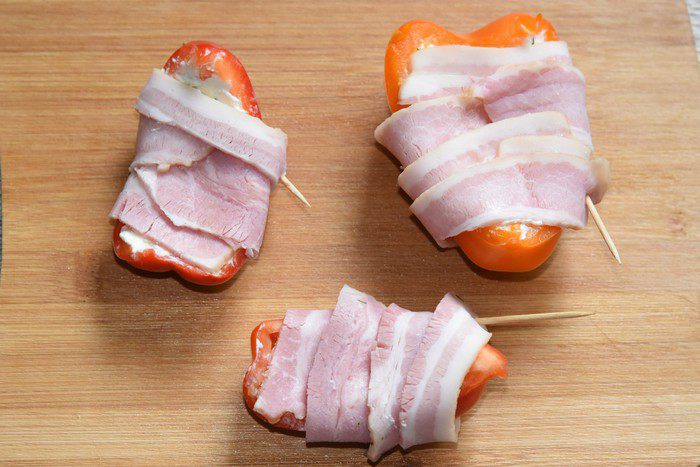 Нафаршированный перец завернуть в бекон, концы бекона закрепить зубочистками. (В дальнейшем я вынула зубочистки, т.к. запекала перцы в решетке-гриль, где овощи были надежно закреплены).