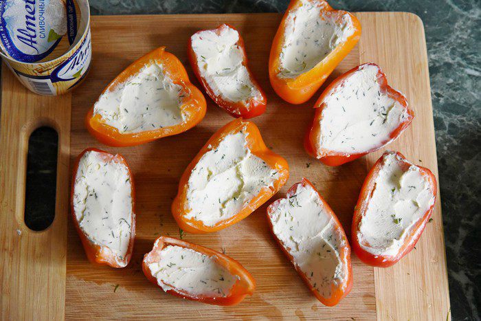 Перцы помыть и разрезать вдоль граней. Осторожно очистить от семян, чтобы не задеть стенки получившихся «лодочек».