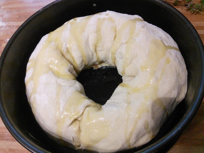Свернём в рулет, рулет в кольцо, закрепим края, уложим швом вниз в форму, смазанную маслом, а можно просто на противень с бумагой.