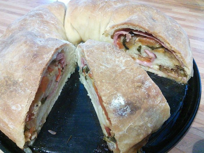 Tortano – тортано. Выпекается по всему региону Кампания. Изготавливается из муки из мягких сортов пшеницы с использованием топлёного свиного жира и пивных дрожжей. Вообще эта выпечка относится к сортам хлеба, т. к. топлёный свиной жир заменён в ней на хорошее оливковое масло, то мне показалось уместным занести её в разряд "пироги", но лично мне тортано напомнил "кальцоне" — итальянский пирог, на самом деле являющийся закрытой формой пиццы. В любом случае настоятельно рекомендую, вкусно !