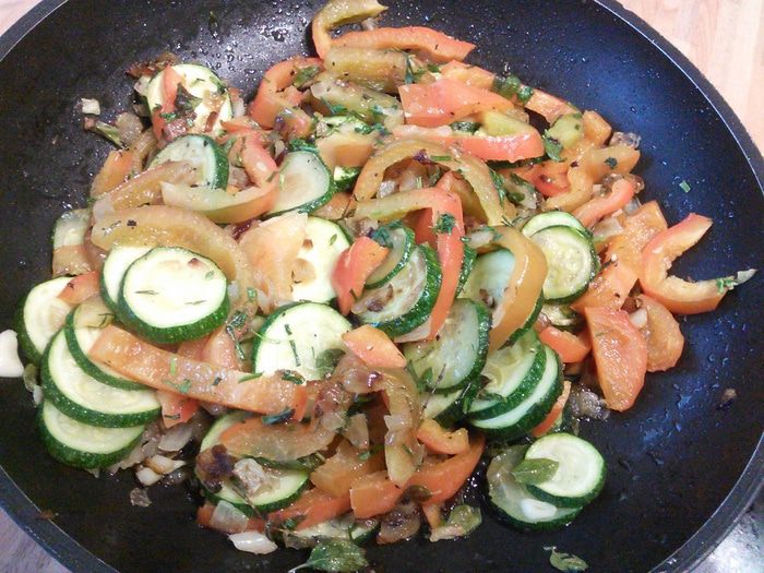 Для начинки пассеруем мелко порубленный лук, добавляем чеснок, кружочками нарезанные цукини (кабачки) и перец. Добавляем травы, солим, перчим и доводим до полуготовности. Остужаем.