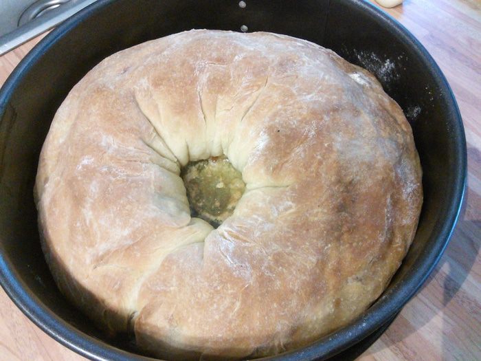 Сбрызнем оливковым маслом, духовку разогреем до 225°C. Поместим пирог в духовку и снизим температуру до 200 °.