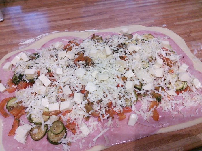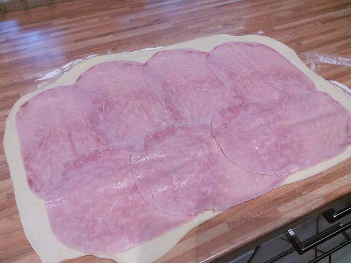 Выложим ветчину тонкой нарезки, отступая приблизительно 2 см от конца теста.