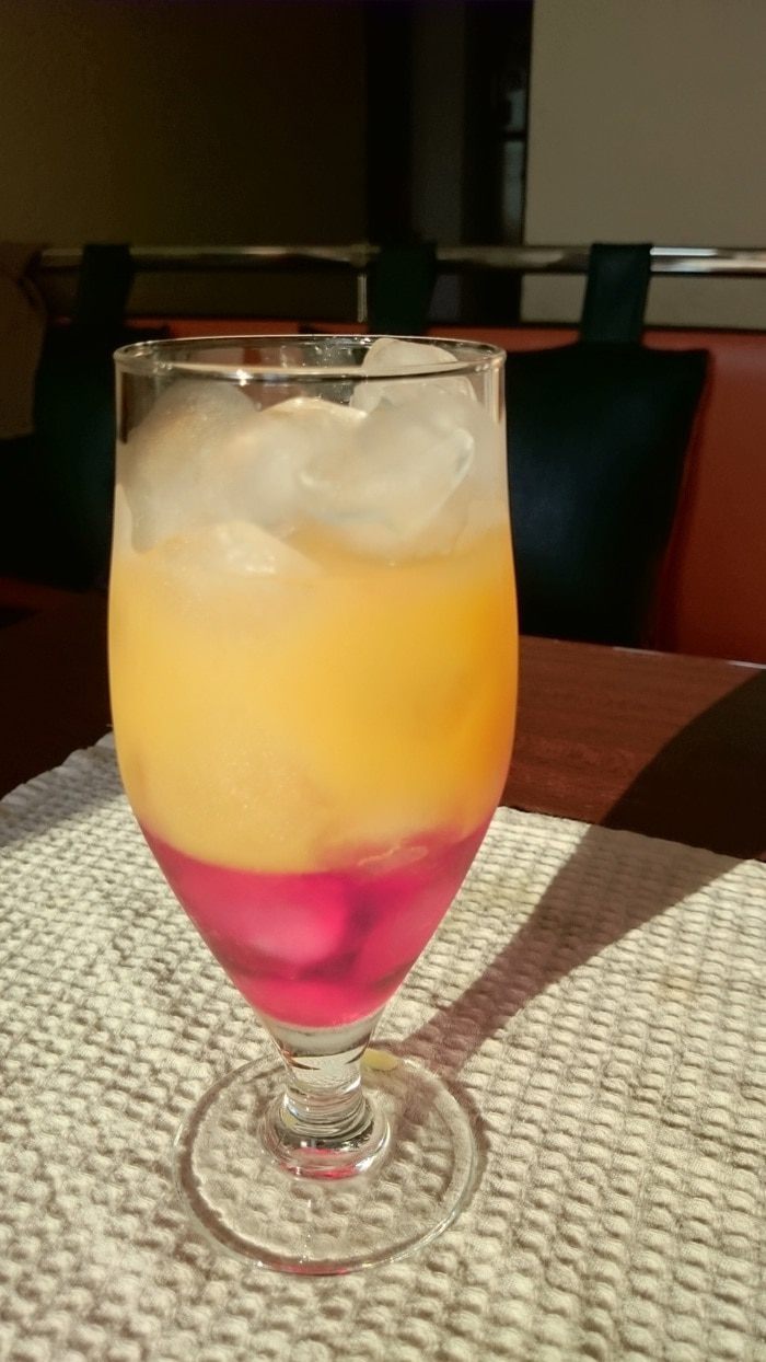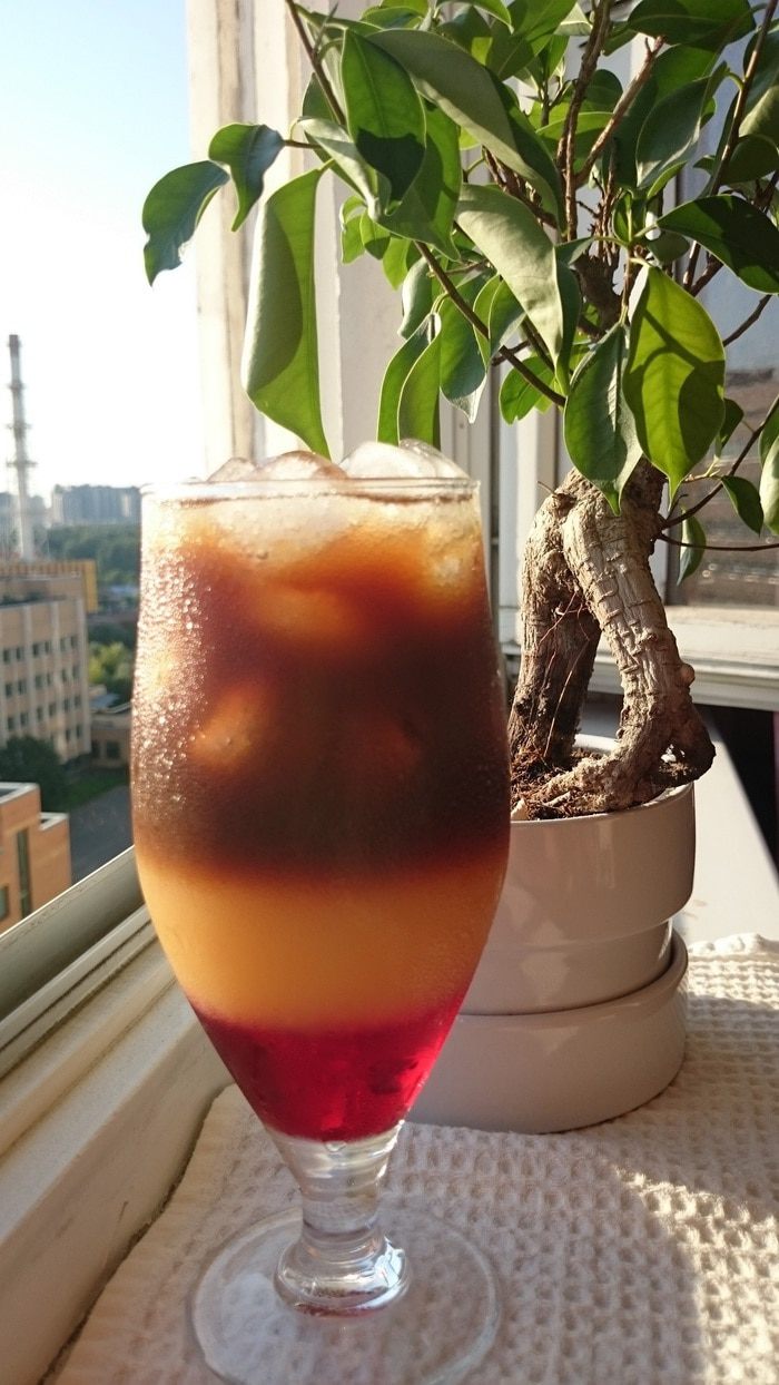 Так же по льду налить охлажденную смесь апельсинового и ананасового соков, должны получиться слои.