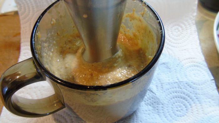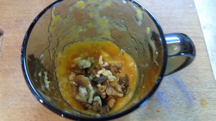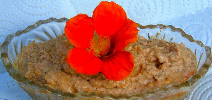 Взбить блендером цветки настурции с оливковый маслом. Продолжая взбивать, частями добавлять обжаренные грецкие орехи.