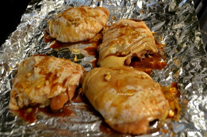Готовим на гриле или в духовке. В духовке при температуре 200 градусов 50 минут, 1 раз перевернув и смазав вновь маринадом. Подаем к столу с горячим гарниром. Приятного аппетита.