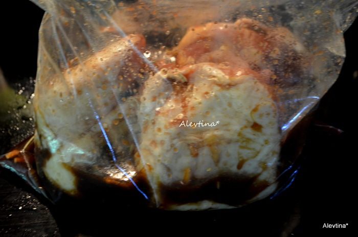 Добавим в маринад куриные бедра и поставим в холодильник на час мариновать.