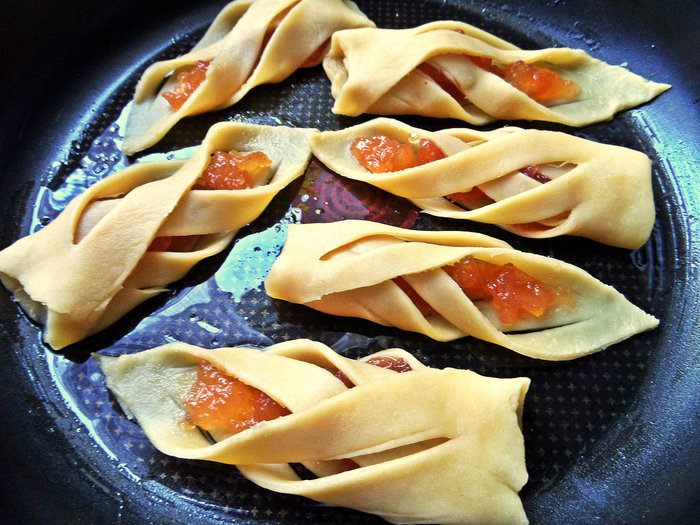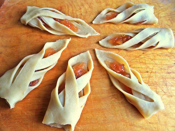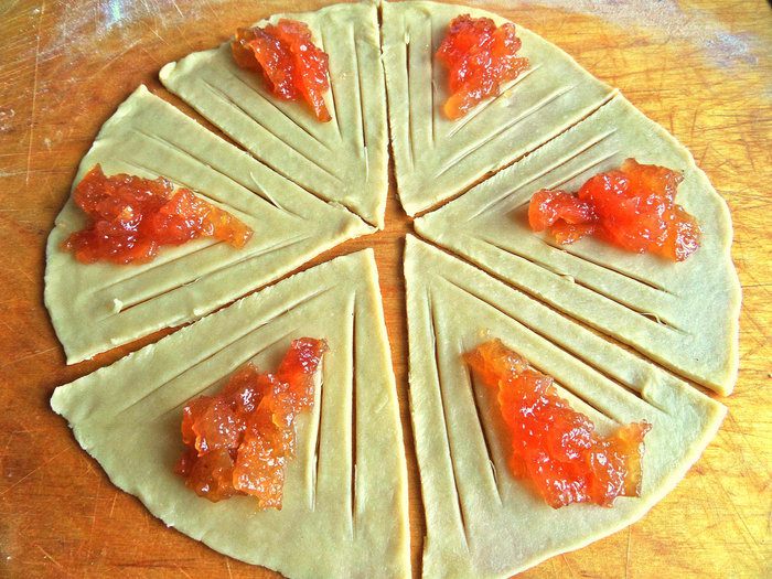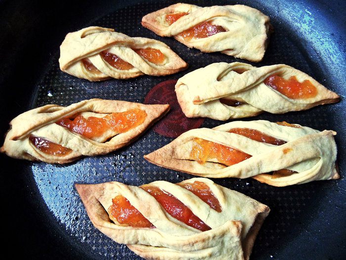 Первая начинка-густой яблочный джем. Наносим в серединку по чайной ложке.