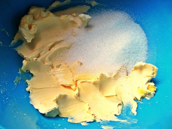 Растираем мягкое масло или маргарин с мелким сахаром и ванилью.