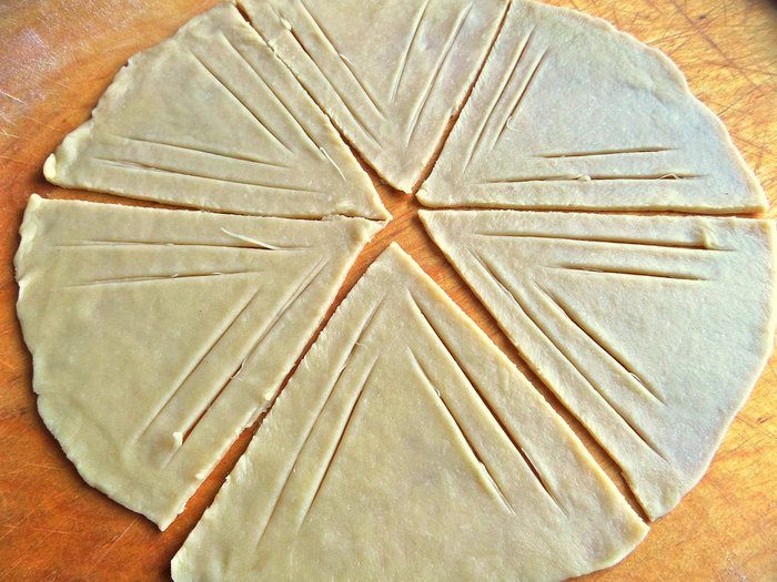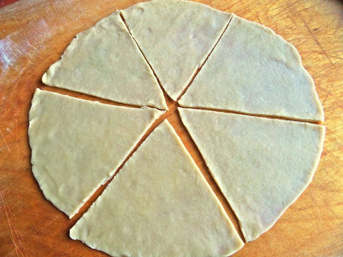 Раскатать четвертушку теста тонко на доске с мукой в круг.