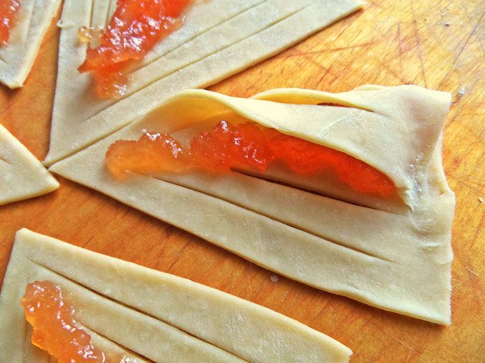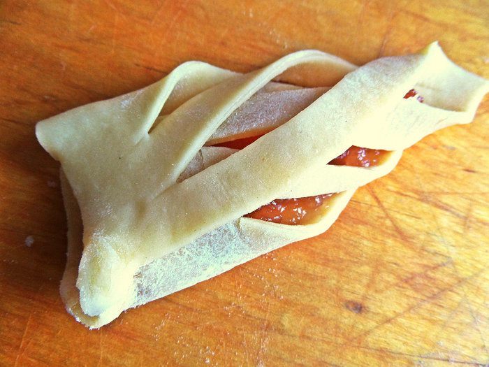 Накрываем нежное тесто с одной стороны, фиксируем пальцем.
