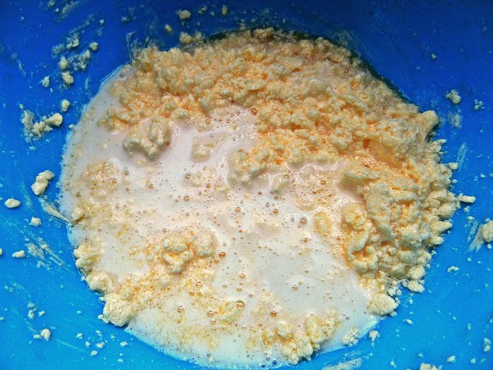 Майонез (он добавит рассыпчатости) развести водой и влить в состав.