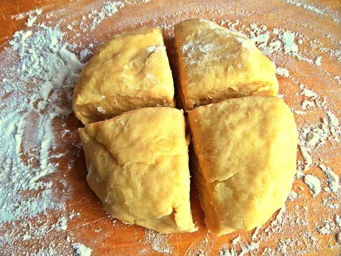 Далее разделим шар на 4 части, одну оставим, остальные снова накроем. Каждую часть скатать перед работой снова в шар.