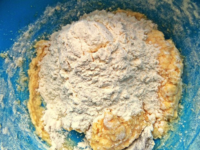 В конце просеиваем муку с разрыхлителем и замешиваем окончательно тесто.