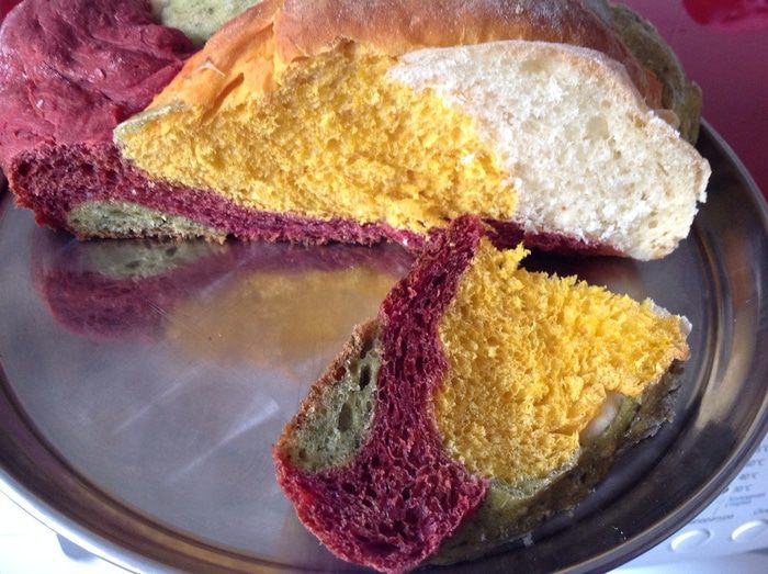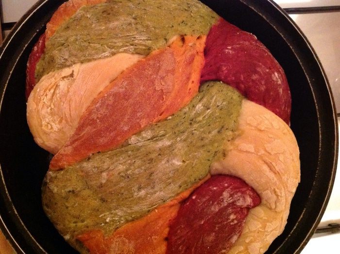 Добавляем четвертую часть от указанного в ингредиентах количества дрожжей, сахара, соли, оливкового масла и муки, отставляем подходить в теплом месте. Когда закваска подойдет, замешиваем 4 теста-зеленое (луковое), красное (свекольное), желтое (морковное), белое, досыпав муки.