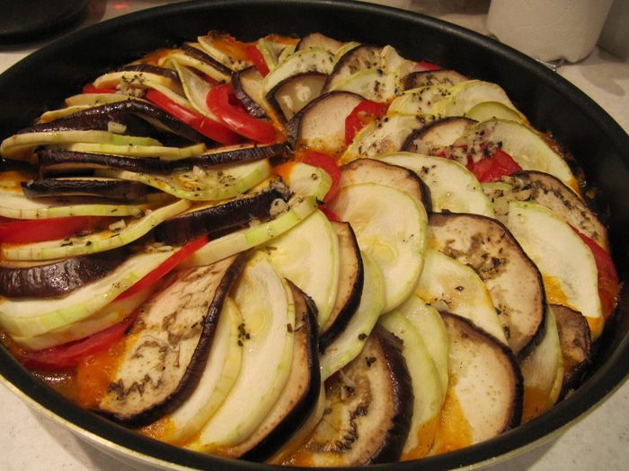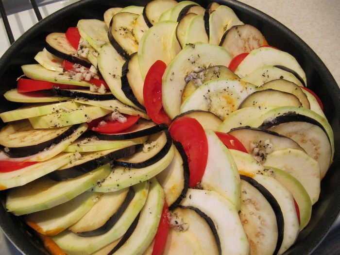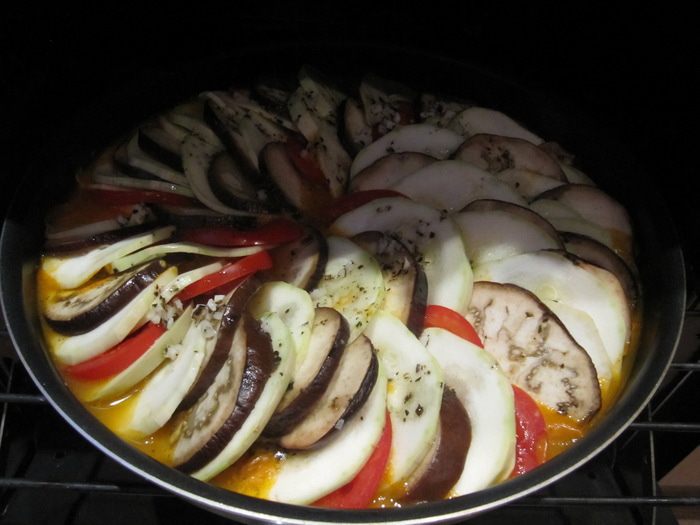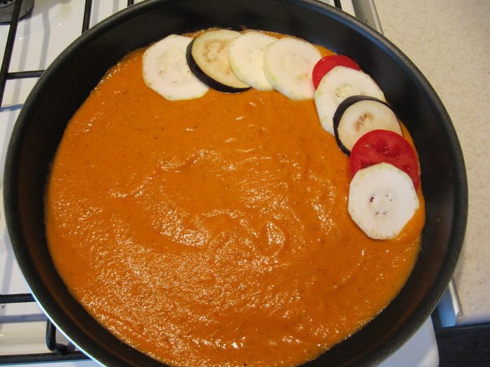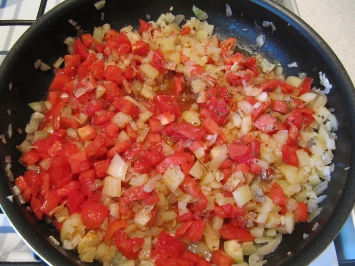 Приготовим соус. Лук и 2 зубчика чеснока измельчить и обжарить до золотистого цвета на 2 ст.л. растительного масла. Добавить порезанный мелкими кубиками перец и обжаривать 5 мин. У 3 томатов снять кожицу. Для этого сделать крестообразные надрезы, залить кипятком, оставить на несколько минут и опустить в ледяную воду, после чего кожица легко отойдет. Очищенные томаты измельчить кубиком и добавить к перцам с луком вместе с сушеным тимьяном, солью и перцем. Тушить под закрытой крышкой на медленном огне 10 мин.