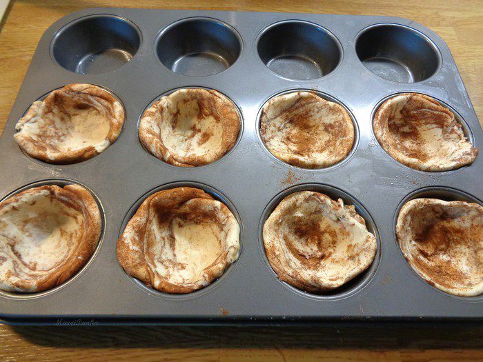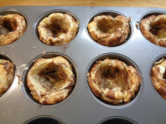 Раскатать в кружок при помощи скалки и положить в форму для кексов. Пальцами оформить бортики, а донышко каждого пирожного прижать большими пальцами рук.
