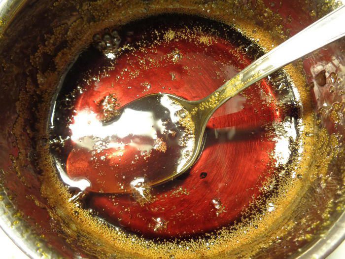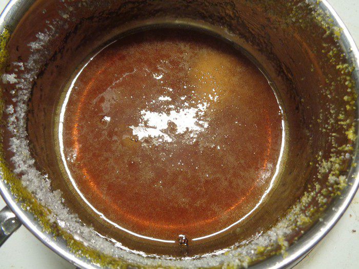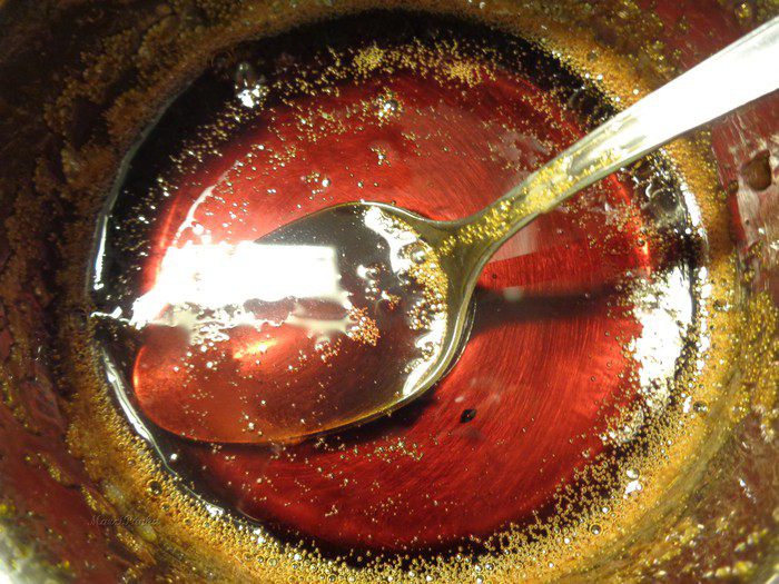 Помешивать и томить на огне до тех пор, пока сироп не превратиться в карамель. Это может занять времени от 1 минуты до 5. Так что не отходить от плиты и контролировать процесс.